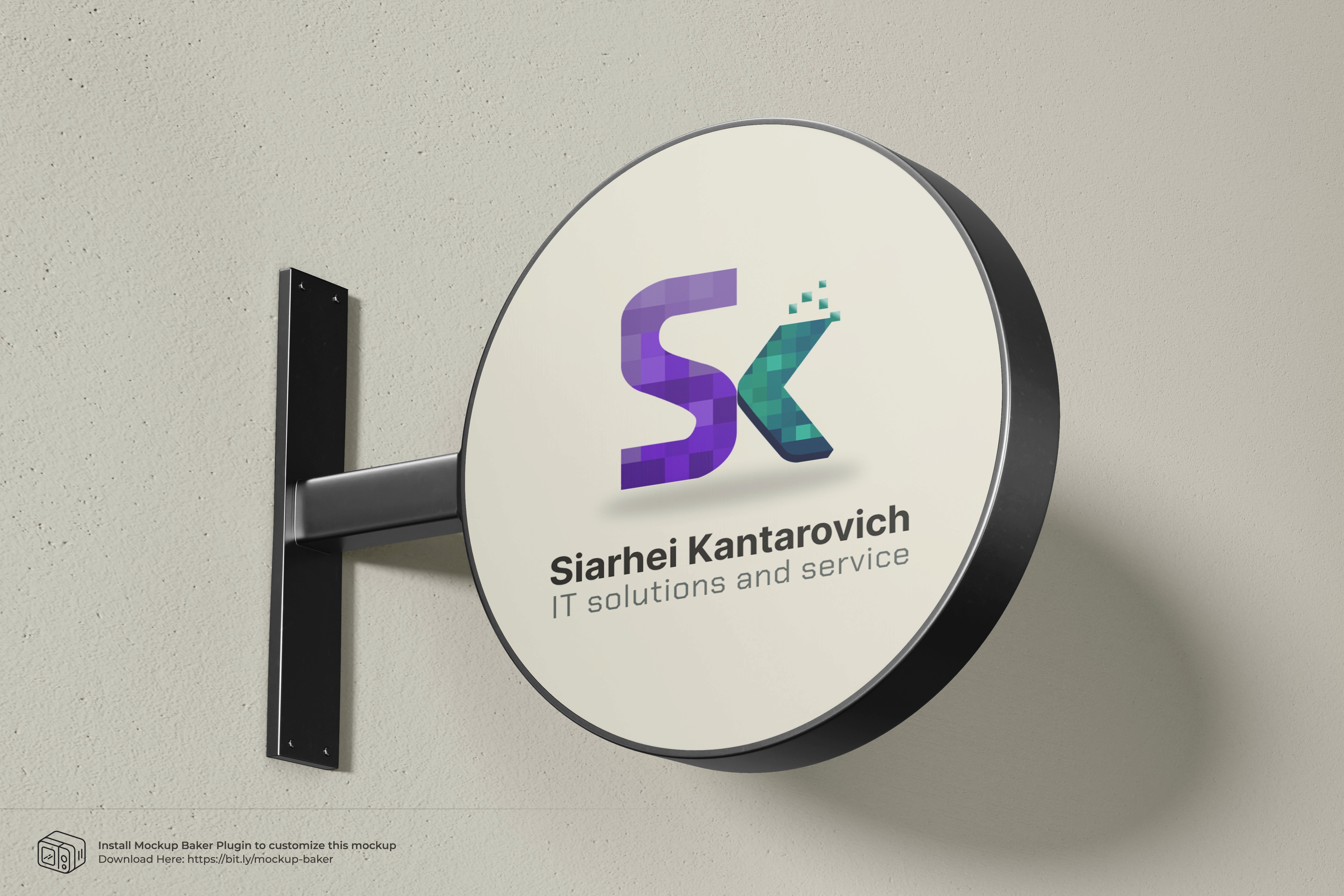 The mark is built on the geometry of the letters S and K. A mosaic (pixelation) effect is used to metaphorically represent data structure and scalability. The purple-to-teal color scheme conveys creativity and innovation.